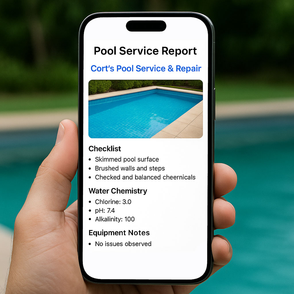 Terrence Mosley2025-08-11Trustindex verifies that the original source of the review is Google. Todd has done a fantastic job with our pool it hasn't look this good in years Donna Carter2025-08-11Trustindex verifies that the original source of the review is Google. Todd is amazing!! He is very detailed and thorough each week he comes out. Our pool is always clear and clean. Julianne Fox2025-08-08Trustindex verifies that the original source of the review is Google. I can’t recommend Cort’s Pools enough! He’s always on time, professional, and takes great care of my pool. The water is always crystal clear, and he never misses a detail. It’s rare to find someone this reliable and consistent—definitely the best pool service I’ve ever had! Timothy Bergquist2025-08-07Trustindex verifies that the original source of the review is Google. Very pleased with Corts pool services. Nick and Vince do an excellent job taking care of our pool. Alexia Williams2025-08-06Trustindex verifies that the original source of the review is Google. best pool service i will ever receive Andy Amato2025-08-05Trustindex verifies that the original source of the review is Google. I've been using Corts Pool services for the past two years and have found them very dependable. Todd is here every a Tuesday like clockwork always keepsme informed on the status of the water. Todd also provides valuable information to help me keep things right. As a bonus he takes time to have some fun with my dog Stella that gets super happy when she sees him pull-up. Additionally, Corts provides filter cleaning and any type of mechanical repairs necessary at reasonable rates. Highly recommend this company for all of your pool needs. Cindi Gahan2025-08-04Trustindex verifies that the original source of the review is Google. Best Pool guy in the business!! Todd Postel Keith C2025-07-30Trustindex verifies that the original source of the review is Google. Great ssrvice Marcus Caporaso2025-07-30Trustindex verifies that the original source of the review is Google. Great service. Courteous, extremely knowledgeable, and helpful for all questions and pool maintenance advice. Pool is always clean and presentable. I appreciate the previous owners already having this service set up when I purchased the home and will continue to pay for the service as long as I own the residence. Grateful!